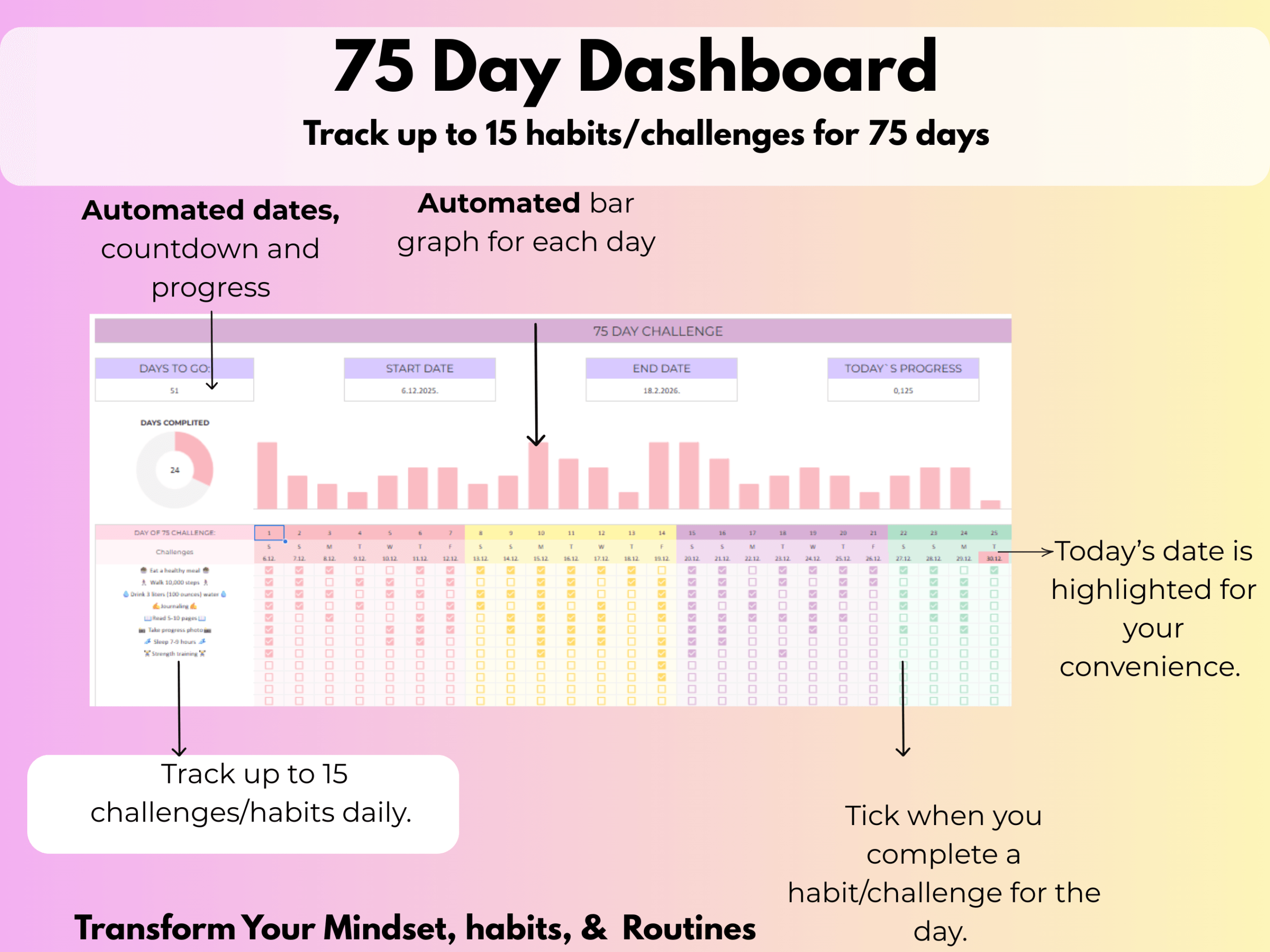 Stay consistent, build discipline, and follow through on your goals with our digital 75-day challenge tracker built in Google Sheets.